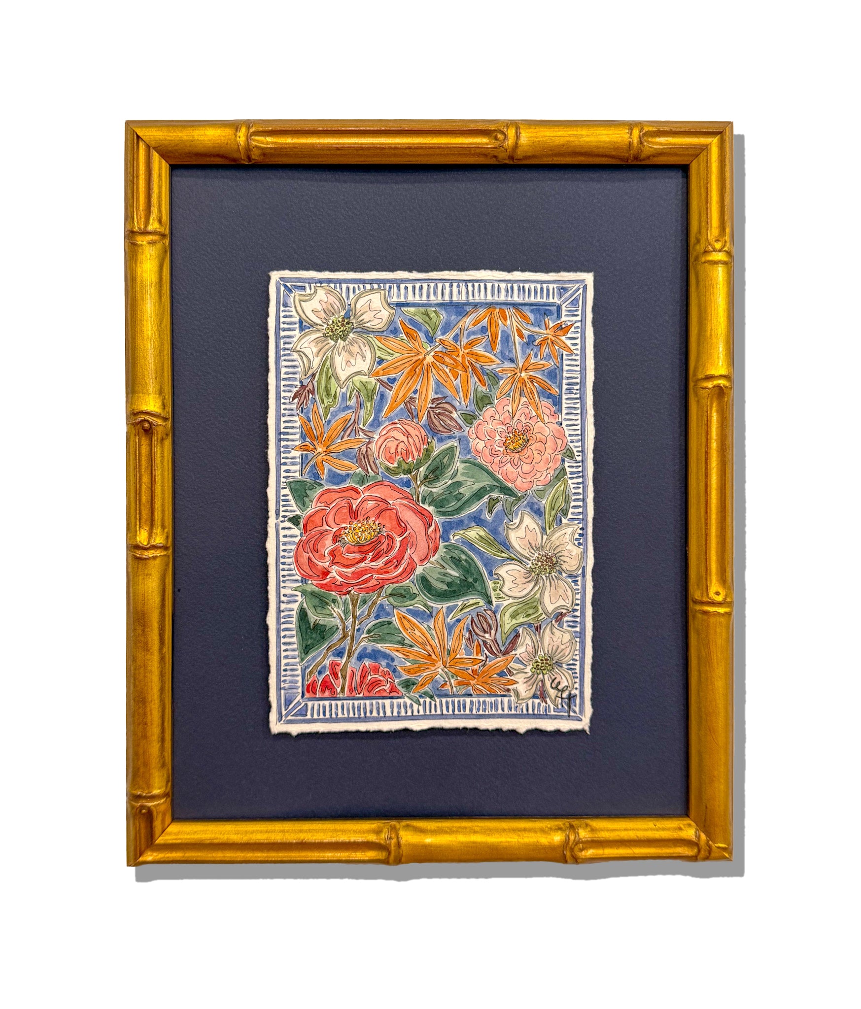 - floated above a navy blue mat and set in a gilded bamboo frame