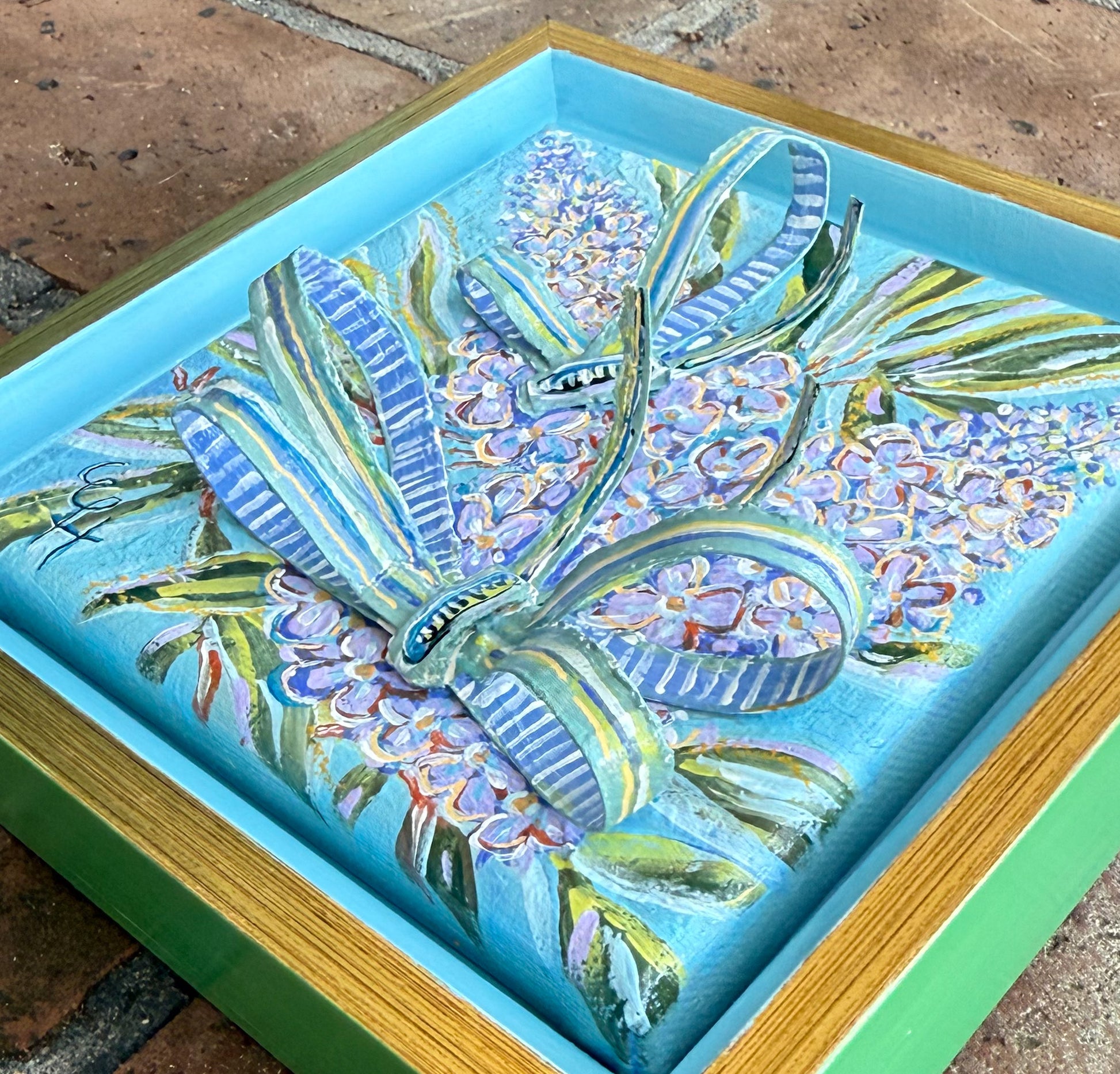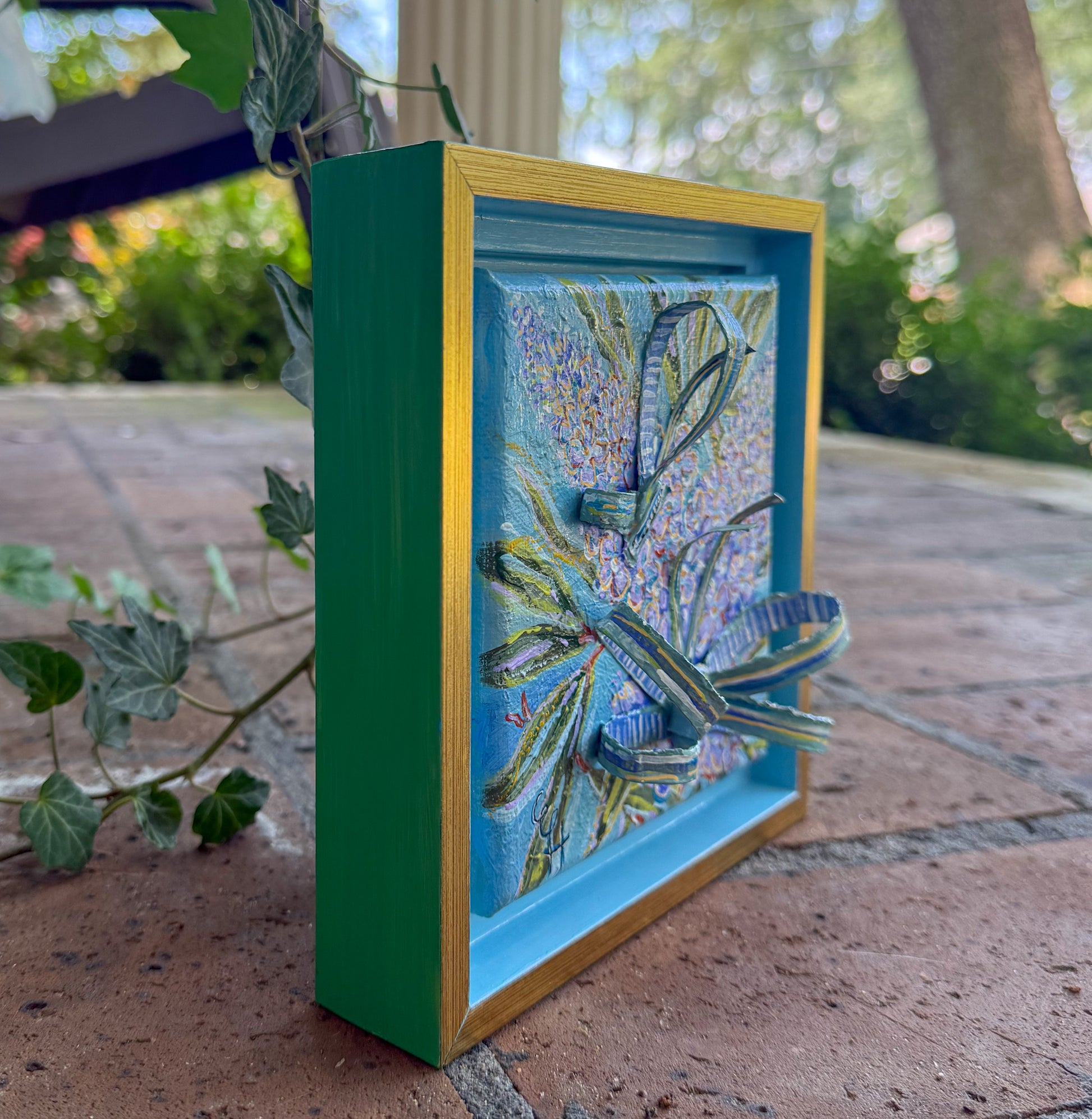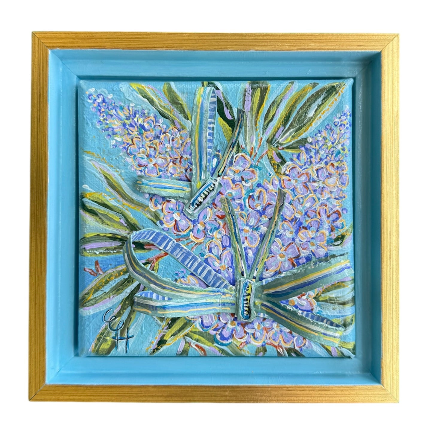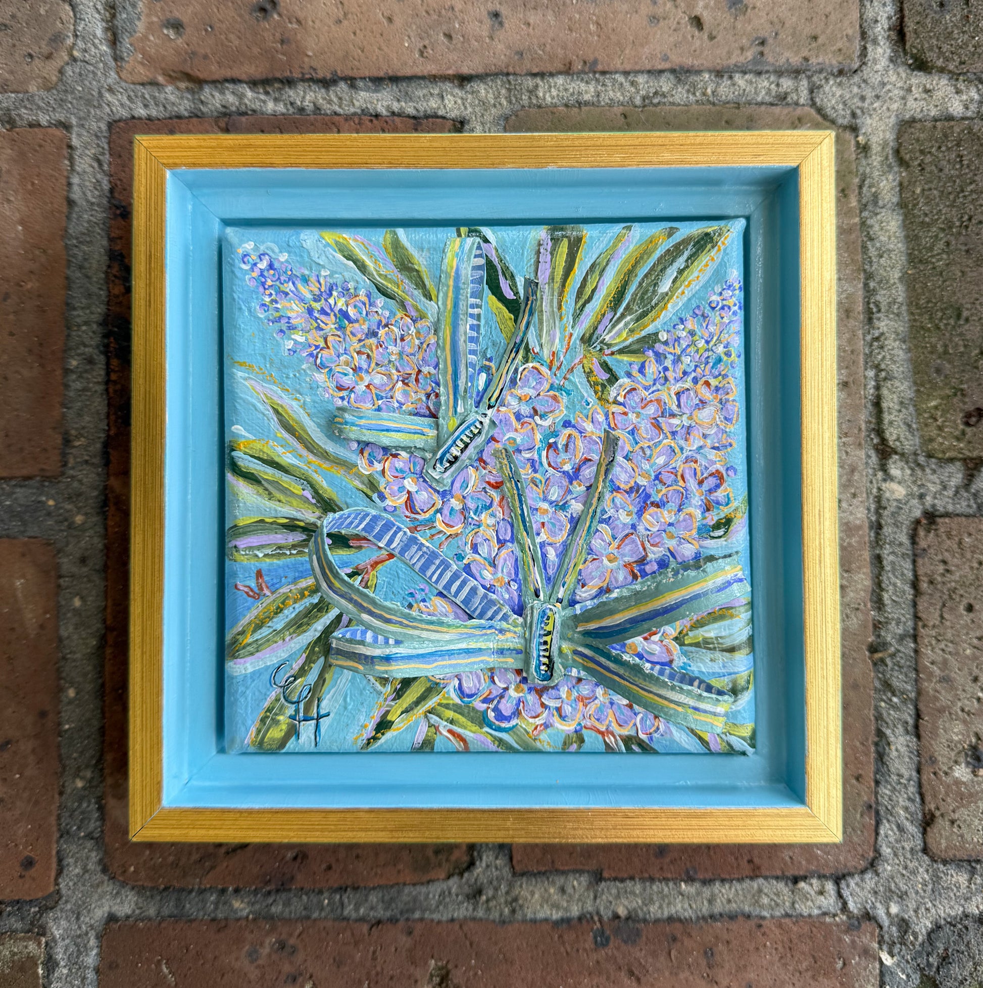 Butterflies hover over lavender-colored butterfly bush blooms in this mixed media piece featuring hand-sculpted, painted paper butterflies affixed to an acrylic painted canvas set in a hand painted, gilded floater frame.