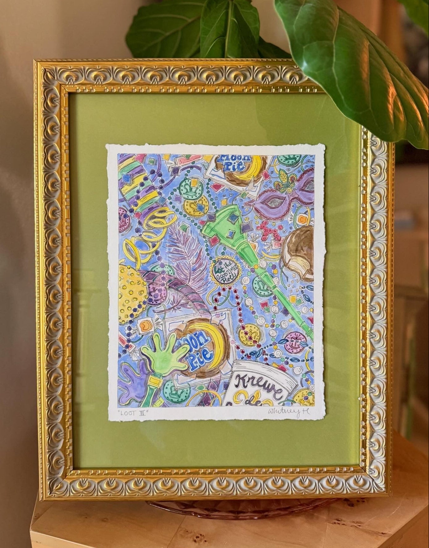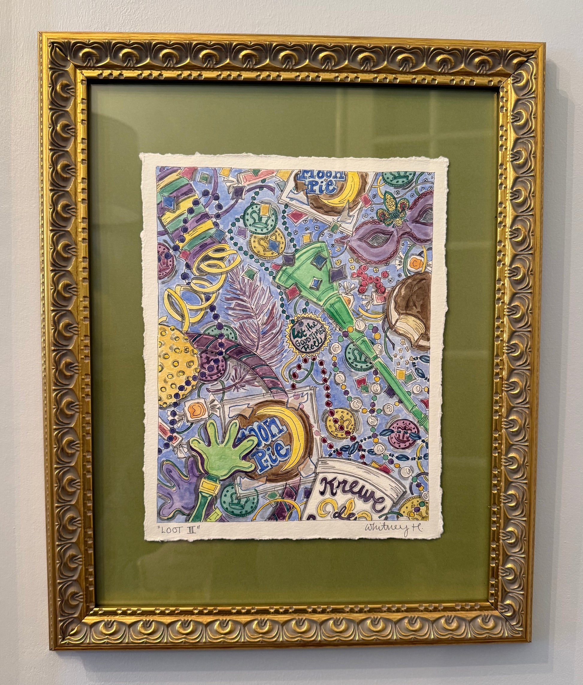 Well, this piece titled "Loot II" is another glimpse inside my childhood bag of Mardi Gras throws that I risked being trampled on by parade horses or run over by a fast-moving float. It's all the colorful good stuff.