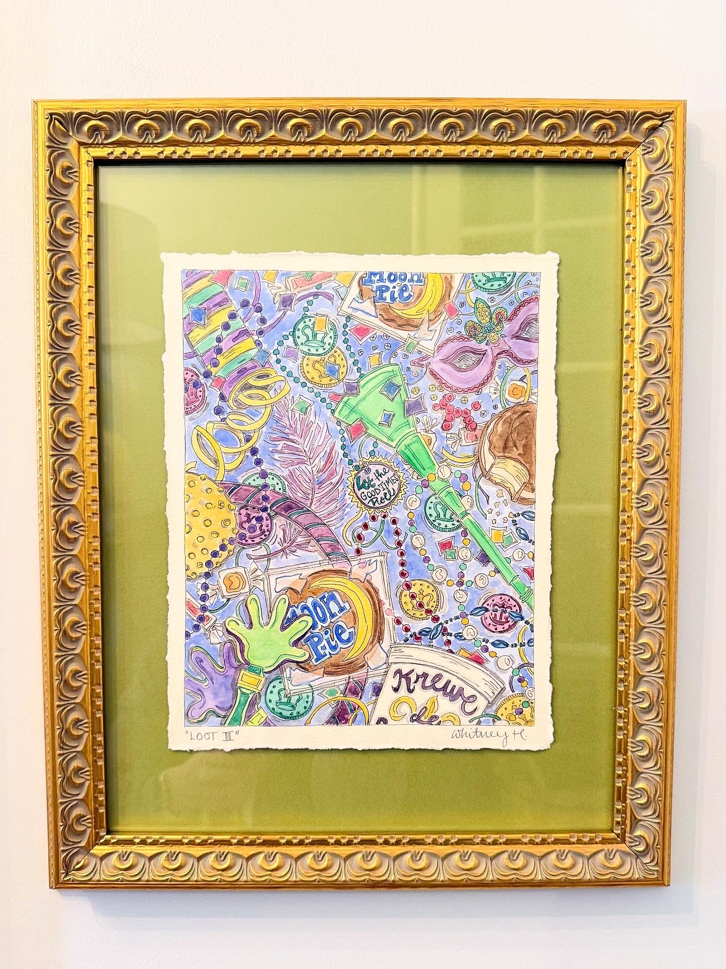 This is a vibrant line & wash work on cold-pressed paper, float framed in an ornate gold setting above a light chartreuse mat.