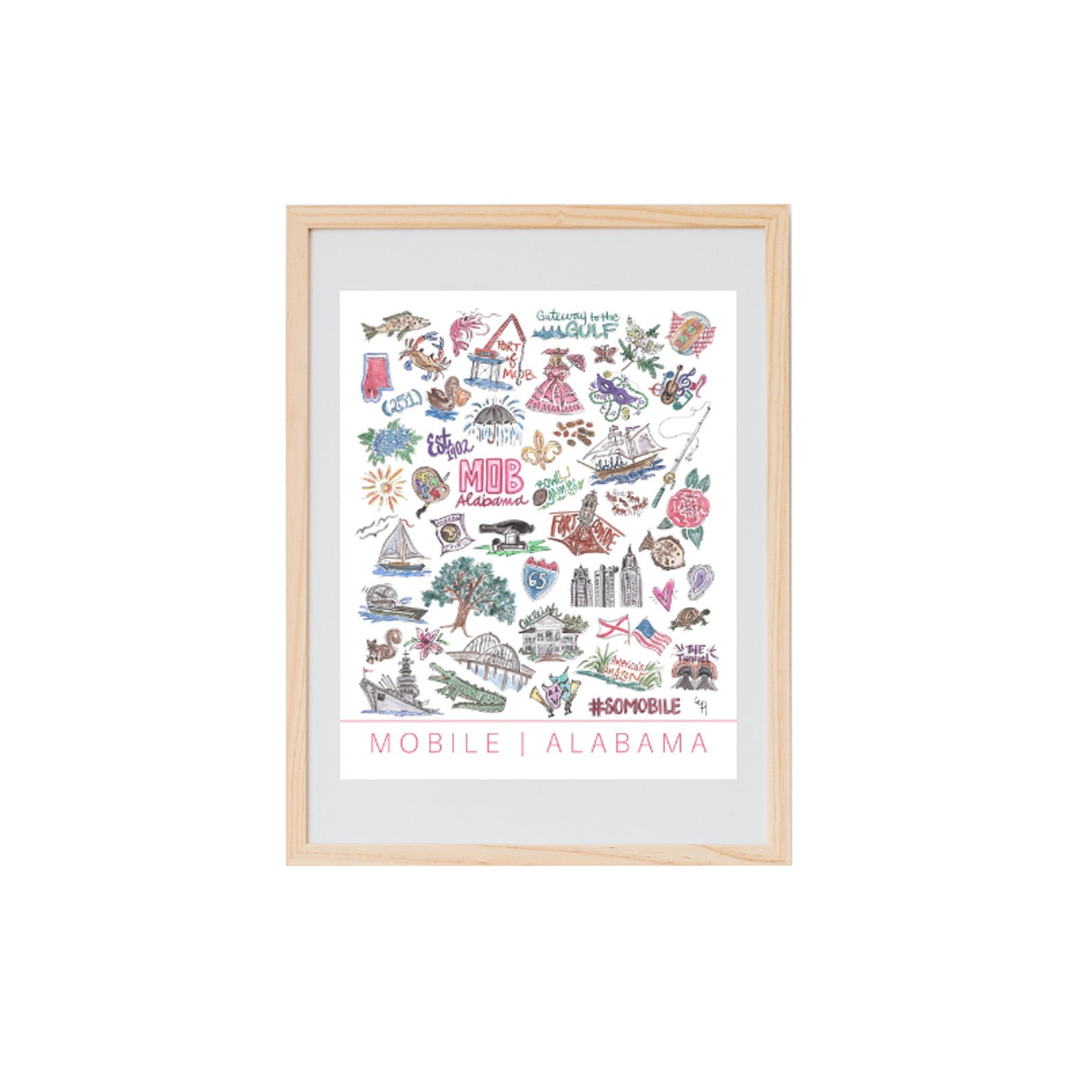 This print features all of the art that the MOBILE, AL SKETCHES collection is based on - line and watercolor renderings of the cultural icons, places, food, sayings, and activities that represent the best of life in the Azalea City.
