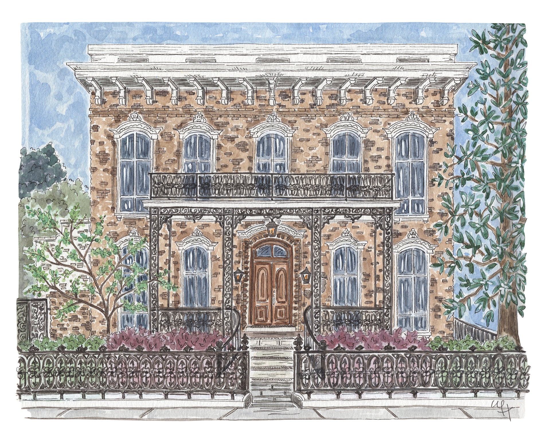 An original watercolor and ink work on paper of the front facade of the Ezell House in Mobile, Alabama. You have the option to purchase the original unframed OR choose the framed option and have a wall-ready work of art shipped directly to your home.