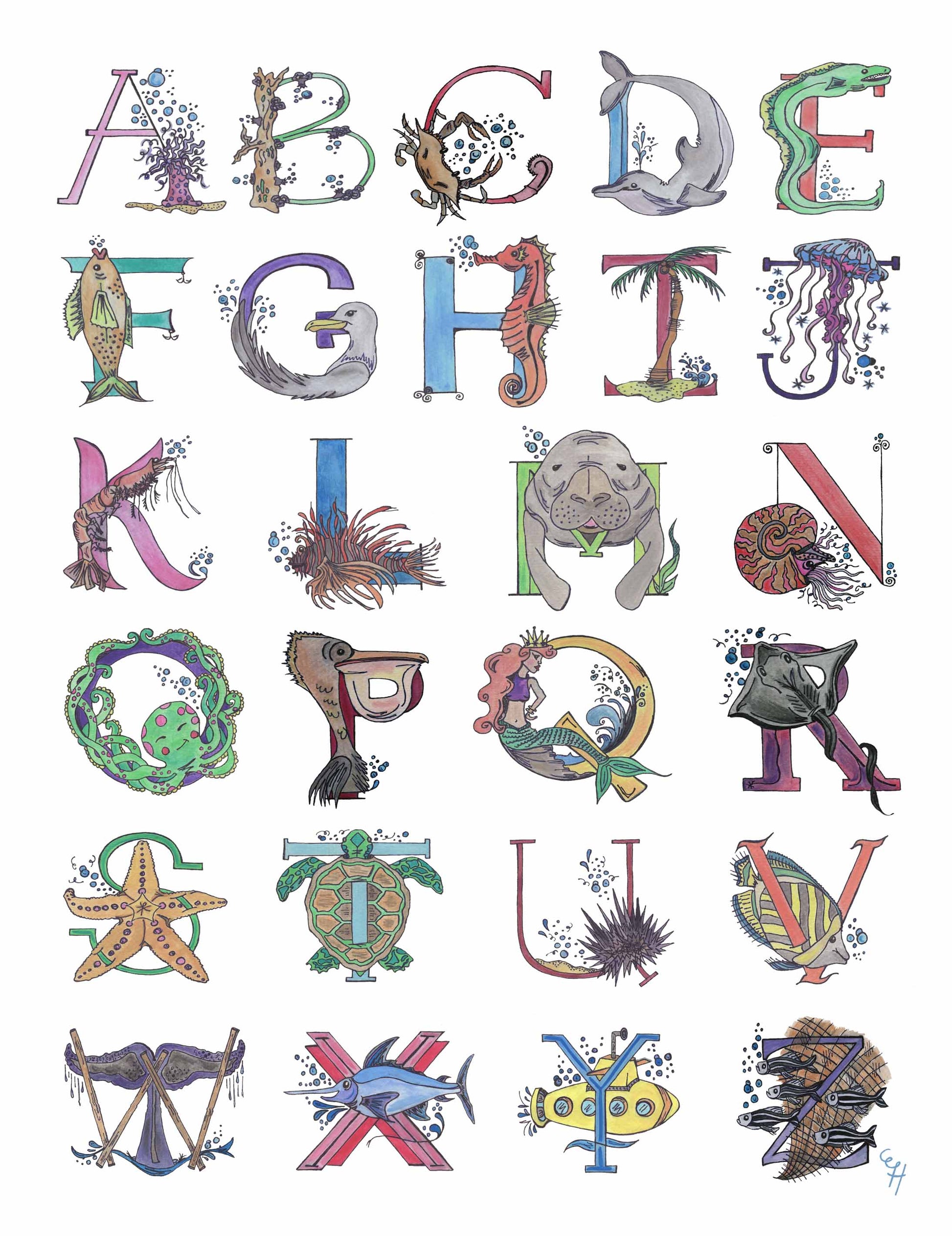 A playful, colorful alphabet featuring sea creatures found along the Alabama Gulf Coast.