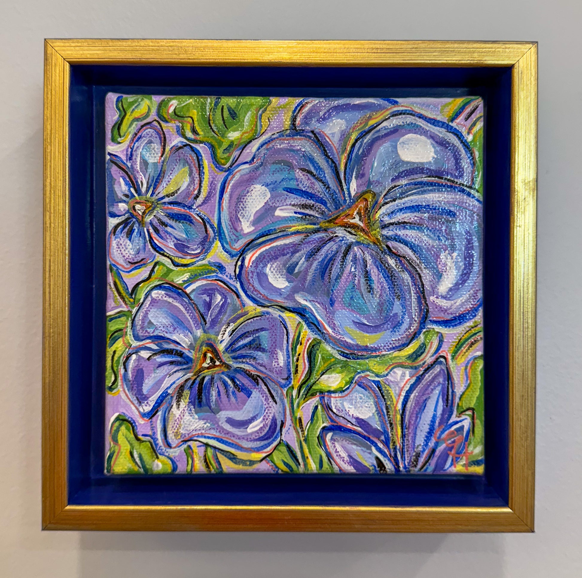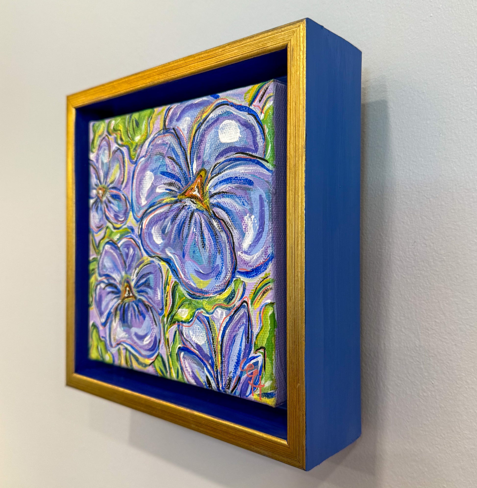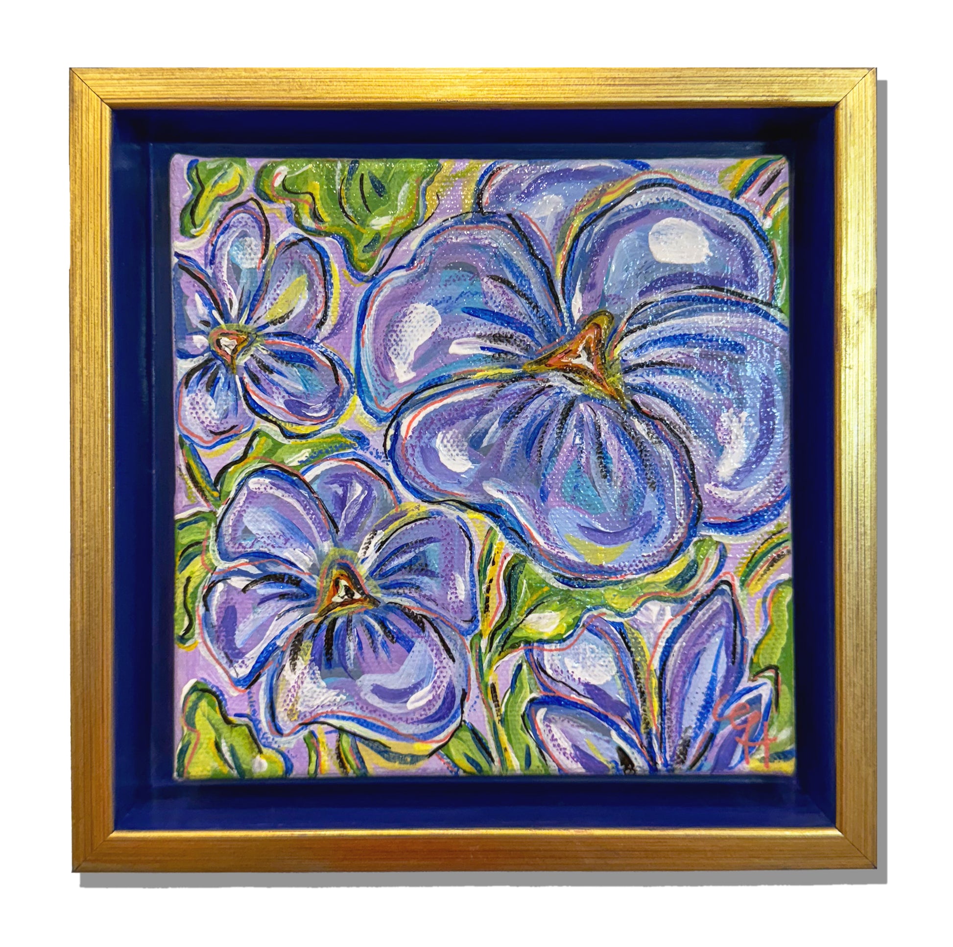 Pansies recreated in acrylic paint, acrylic paint markers & oil pastels on canvas set in a gilded deep cradle box frame. Both the exterior and interior of the frame have been hand painted in contrasting blue-violet hues to accentuate and complement the central artwork.