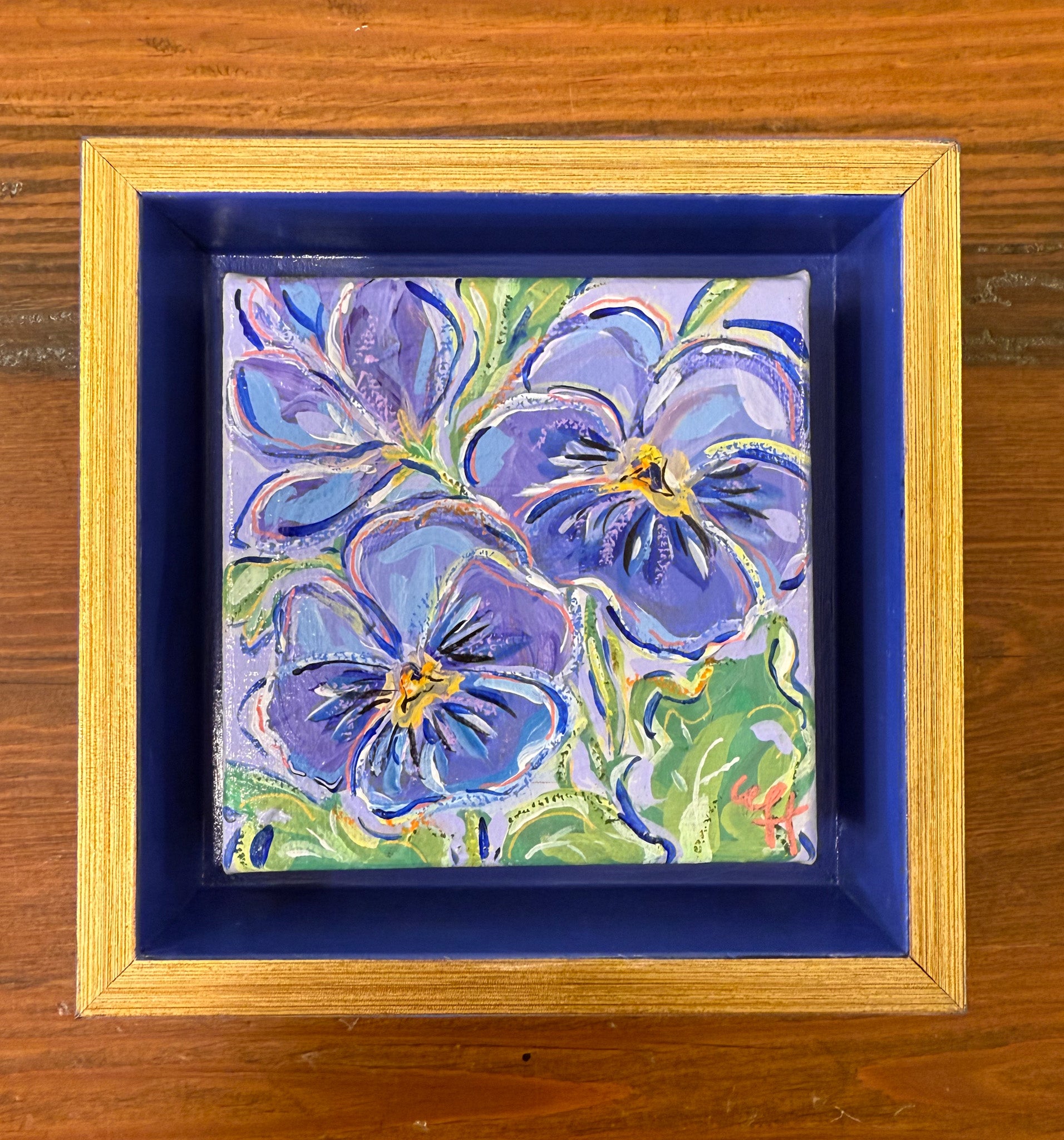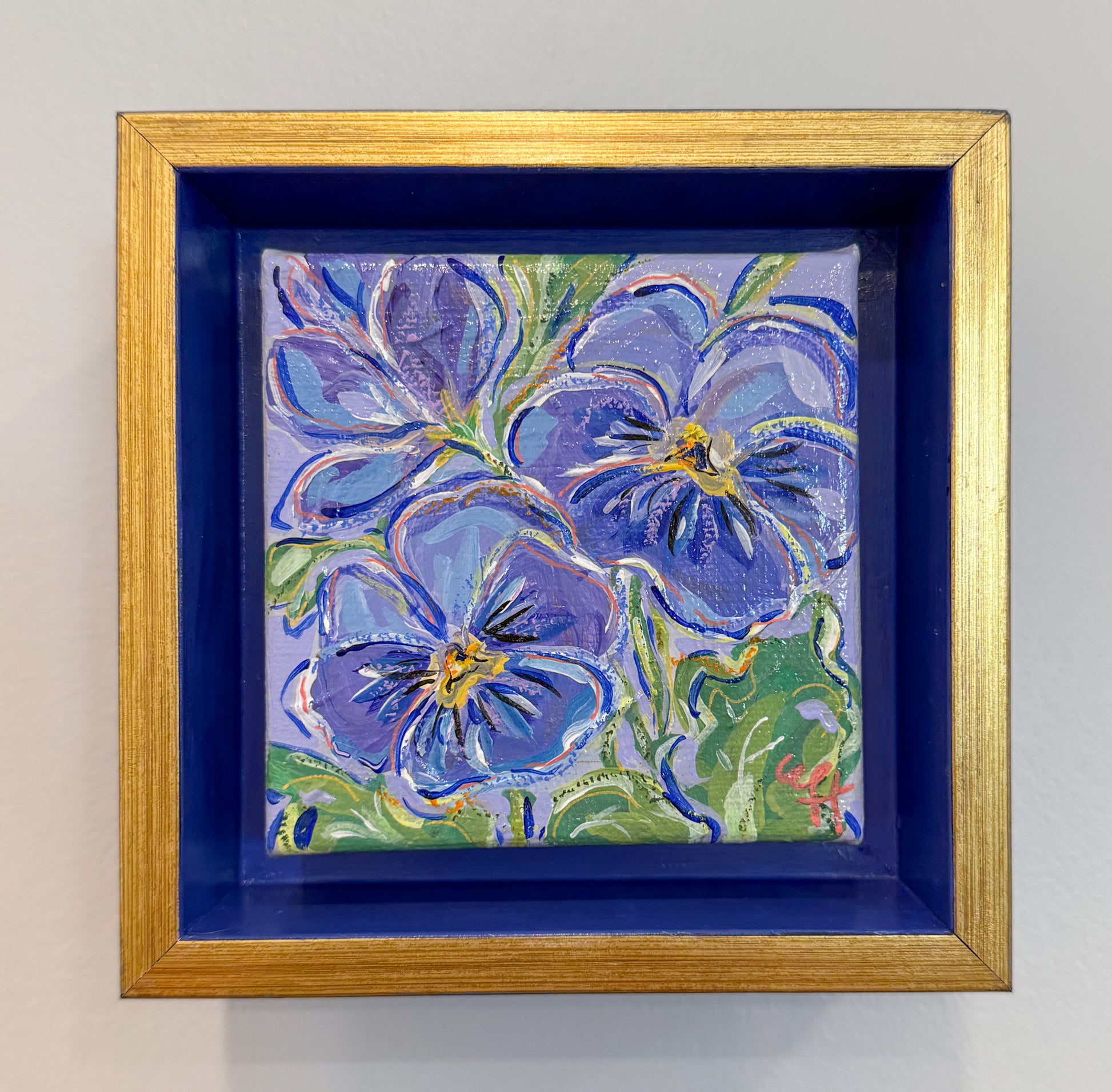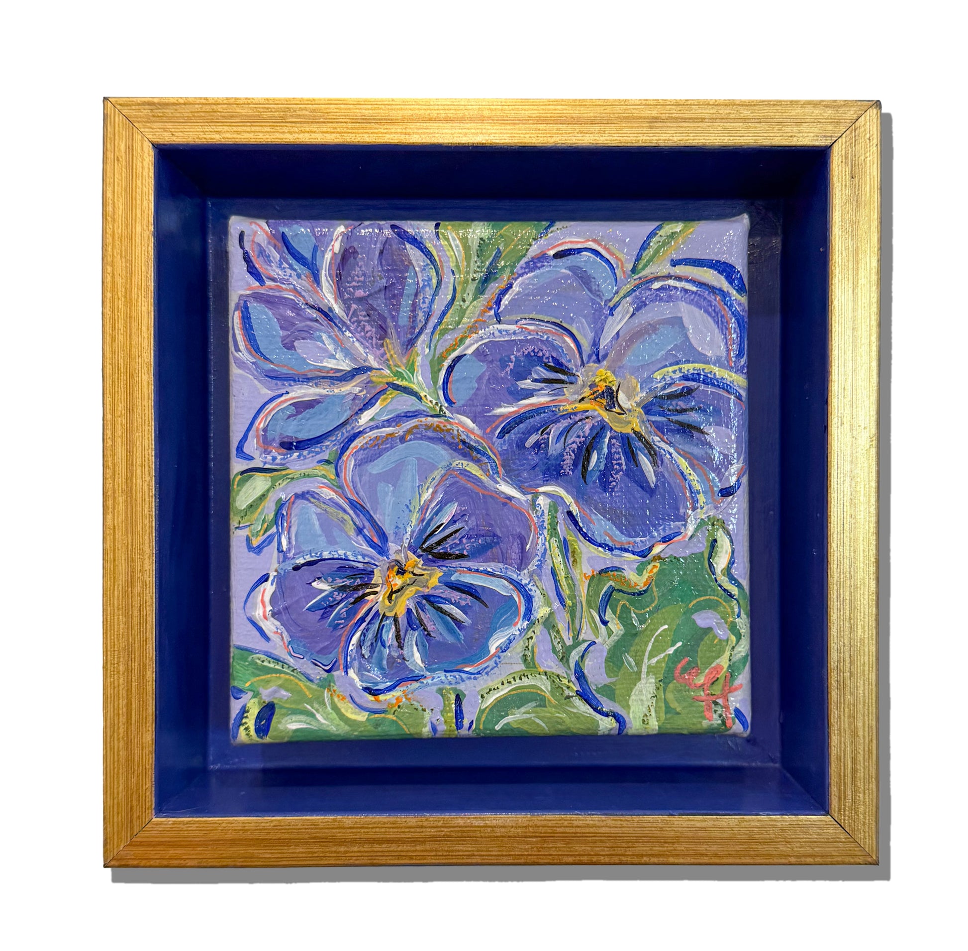 Pansies recreated in acrylic paint, acrylic paint markers & oil pastels on canvas set in a gilded deep cradle box frame. Both the exterior and interior of the frame have been hand painted in contrasting blue-violet hues to accentuate and complement the central artwork.